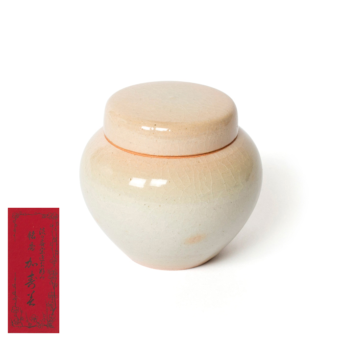 やわらかな形とあけぼの色がやさしい風合いの壷に、和紙を重ねて封をしています。