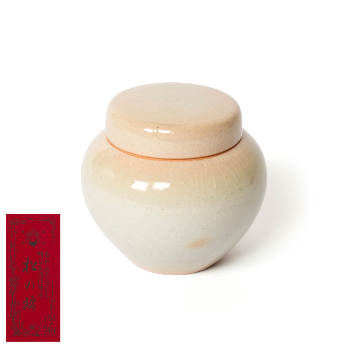 やわらかな形とあけぼの色がやさしい風合いの壷に、和紙を重ねて封をしています。