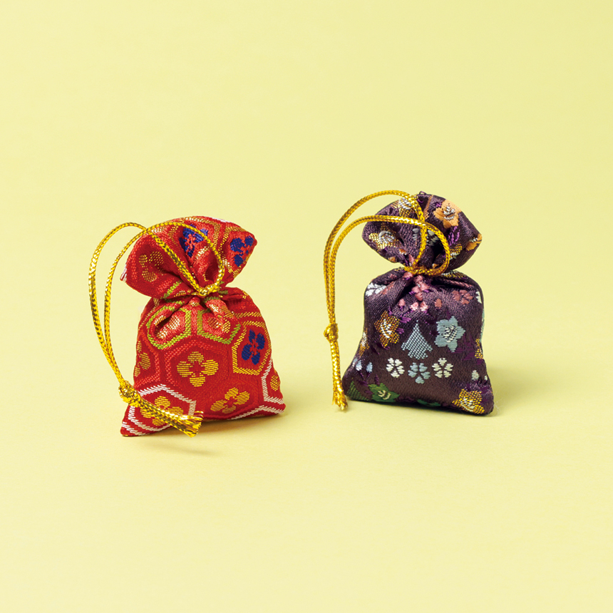京都・西陣織の生地を使った巾着型匂い袋を2つ、スリーブ付のケースにお入れしています。