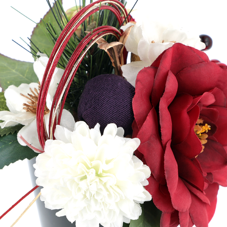 品質や表現にこだわった造花「アーティフィシャルフラワー」のアレンジメントに、ちりめん地の玉状の匂い袋を合わせました。