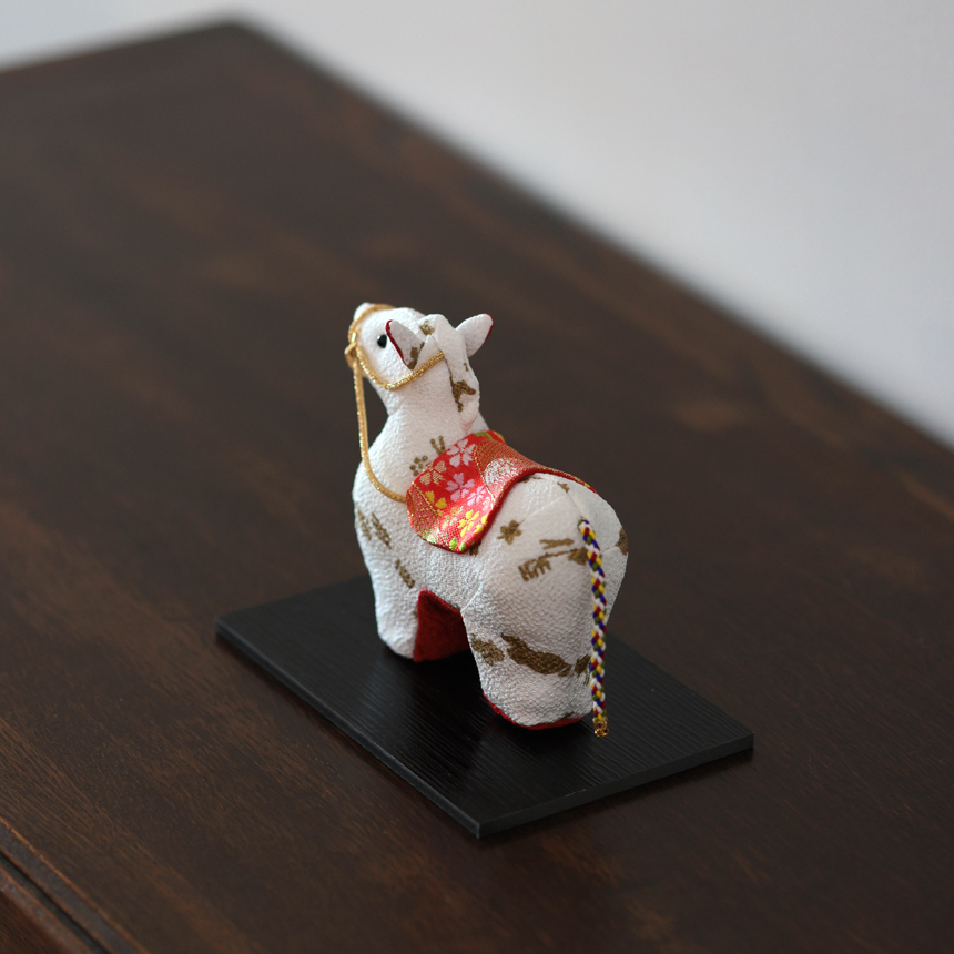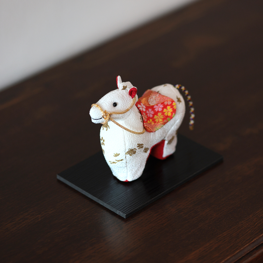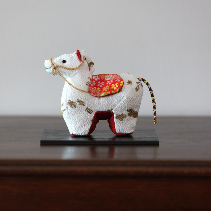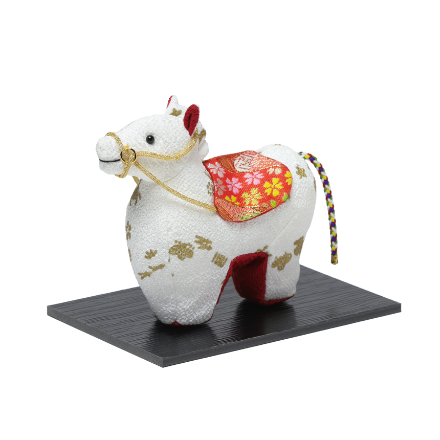 縁起の良い五色の紐の尻尾と、華やかな金襴の鞍をあしらいました。松栄堂オリジナルの匂い袋です。