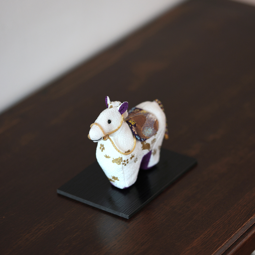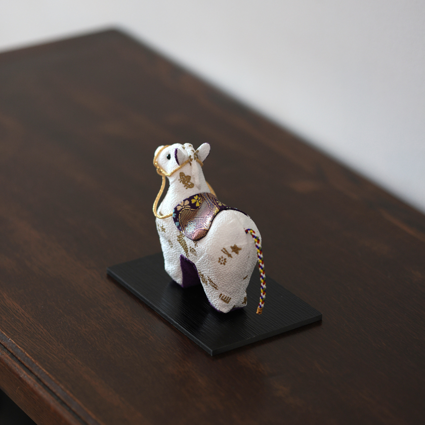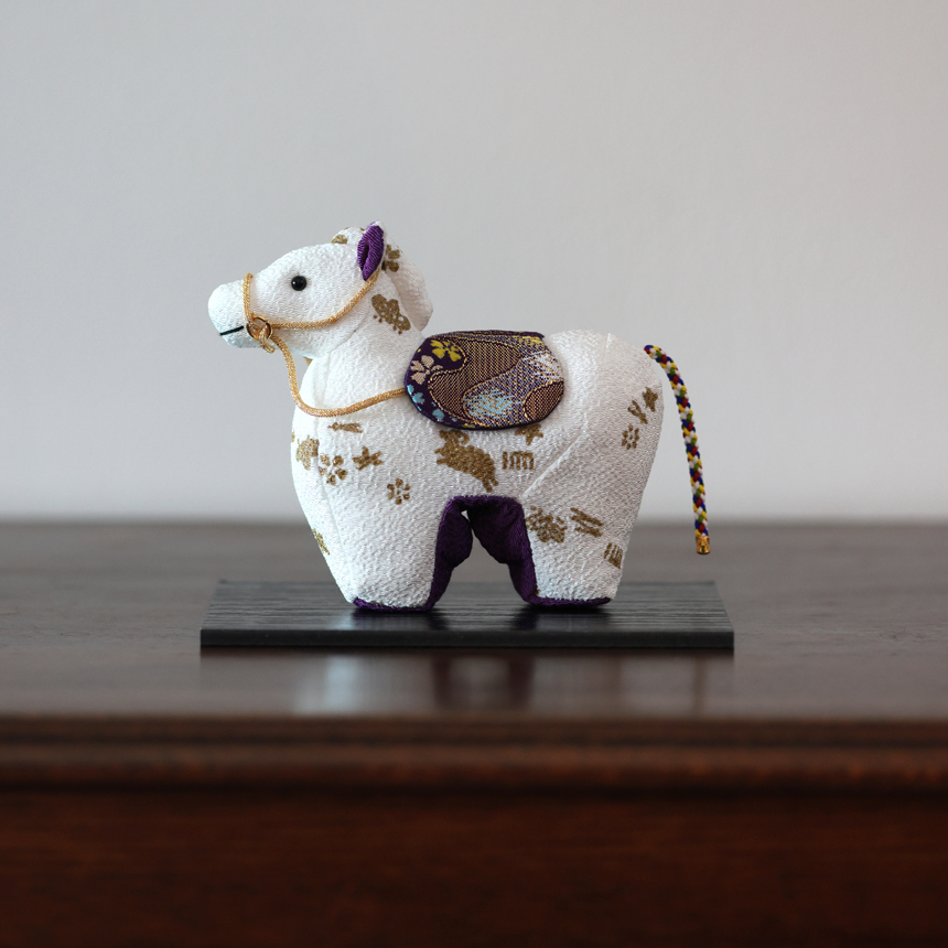 縁起の良い五色の紐の尻尾と、華やかな金襴の鞍をあしらいました。松栄堂オリジナルの匂い袋です。