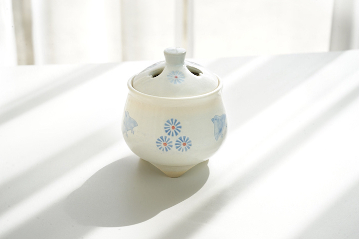 ぷっくりとした香炉には、色土を象嵌した千鳥と小花。