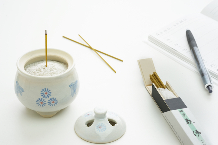 ちょっと香りを楽しみたいとき、ふたを外し、灰を入れておいた香炉にお香を立ててお楽しみください。