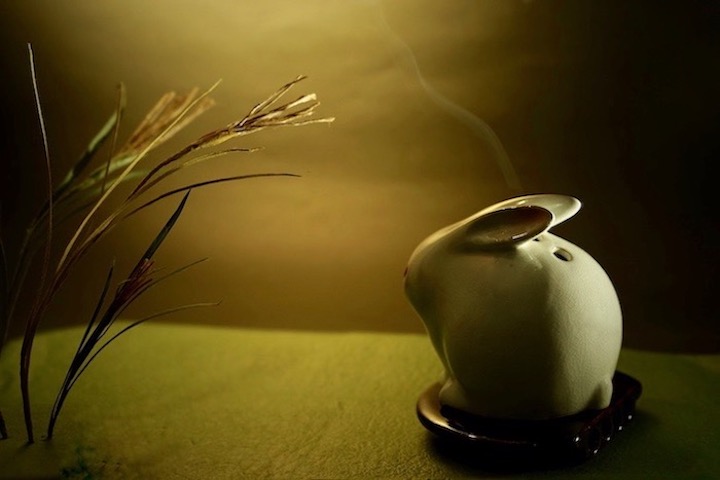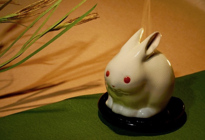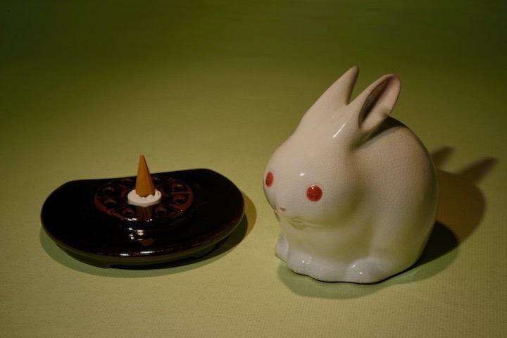 茶色の台座部分に香立をセットし、お香を立て、うさぎをかたどった火屋をかぶせると、背中からゆらゆらと立ち上る煙に、ふんわりと漂う香り……。